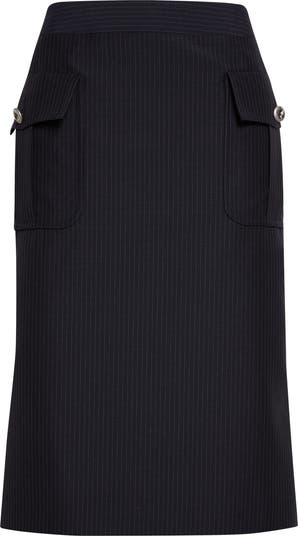 This navy wool-and-mohair pencil skirt in a subtle pinstripe pattern features pleat-centered cargo pockets with silvertone buttons gleaming at the sides.