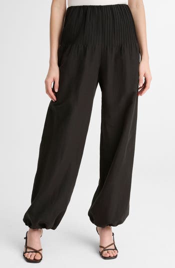 Sweet pintucking gives way to a relaxed fit in bubble-hemmed pants cut from a breezy blend enriched with cotton and linen.