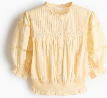 Short blouse in a cotton weave detailed with delicate pintucks and lace insets. Features a frill collar, covered buttons at the front and a yoke with gathers at the front and back. Elbow-length puff sleeves with smocked, frill-trimmed cuffs. Smocked section with a frill trim at the hem.