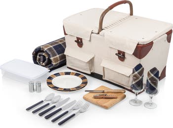Show up to the park or beach like the sizzling trailblazer you are. The Pioneer Deluxe Picnic Basket with Picnic Blanket is a luxurious canvas picnic basket set with vintage chic styling and romantic wine and cheese accessories. This picnic basket for 2 is designed for adventure with its lightweight canvas-covered wooden body, double lid, and swanky service for two. Porcelain plates, hand-blown wine glasses, stainless steel silverware and waiter-style corkscrew, wooden-handled cheese knife, hardwood cutting board, and food storage container all strap securely into this spacious picnic basket set. Even with the matching navy/khaki 100% cotton napkins and picnic blanket there’s still plenty of room for wine, cheese, charcuterie and all your picnic favorites. See ya down on the trail.