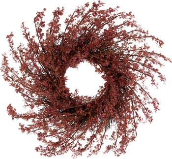 Celebrate the beauty of the season with this berry wreath, a stunning accent piece that captures the warmth and richness of autumn. This lifelike wreath is artfully crafted with clusters of small burgundy and brown pip berries, creating a full, textured design that adds natural charm to any space. The deep berry tones blend beautifully with traditional fall décor, bringing a cozy feel to your home. Perfect for displaying on your front door, entryway, mantel, or wall, this red berry wreath offers a timeless way to decorate for Thanksgiving or throughout the autumn months. Its circular shape and detailed craftsmanship give it a realistic, organic look—without the maintenance of real foliage. Made from sturdy materials, the wreath maintains its rich color and structure season after season. Whether used alone or paired with coordinating garlands and table accents, this fall wreath instantly elevates your home with seasonal style. It’s an elegant way to celebrate Thanksgiving, evoking warmth, gratitude, and natural beauty. Bring a touch of fall’s appeal indoors or out with this burgundy berry wreath—a classic accent for any autumn décor collection. Product Features: Unlit Small burgundy pip berry clusters and twigs design Bendable wire branches for easy styling Sturdy grapevine twig backing for easy hanging - hardware not included Recommended for indoor use - if using outdoors, place under a covered area No assembly required - wreath comes in 1 piece Dimensions: 24" diameter (measured from outermost edge to outermost edge across the wreath) Material(s): twig/foam/plastic/wire Note: Branches are compressed for shipment, and need to be fluffed out upon arrival to look like the photo