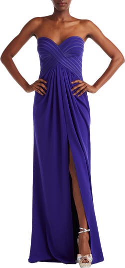Tonal texture traces the captivating silhouette of a side-slit gown that's going to get glasses raised.