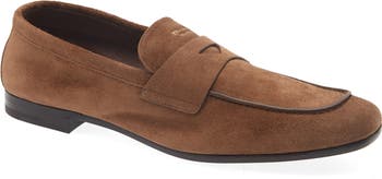 This rich suede penny loafer crafted in Italy is finished with chocolate-brown leather piping for a polished look.