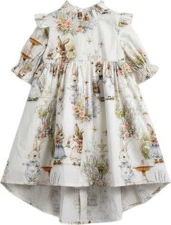 The short sleeve Aoki Dress in Bramble Rabbit is a signature PiperandCloth silhouette designed with structure, softness, and quiet formality. Crafted from 100% woven cotton and fully lined, it offers shape without stiffness and comfort without compromise. The Bramble Rabbit print features delicate woodland rabbits nestled among muted florals on a warm ivory ground. Soft tones of blush, sage, and faded blue create a refined heirloom palette that feels timeless rather than seasonal. A softly tailored bodice is framed by a ruffled stand collar and subtle shoulder frill detail. Structured pleats fall from the waist into a graceful high low hem that adds movement and presence, slightly shorter in the front and extending longer in the back. Covered buttons run along the back for a clean, traditional finish. The attached waist sash ties into a soft bow, shaping the silhouette while maintaining balance. Sleeve Options: Available in Long Sleeve or Short Puff Sleeve. The Long Sleeve version is gently gathered at the wrist for a classic, traditional look. The Short Puff Sleeve version features soft gathering at the shoulder and a cuff that sits above the elbow, offering structure without excess volume. Fit Note: Fits true to size with gentle structure. If between sizes, consider sizing up for additional length. Care: Machine wash cold on delicate. Lay flat or hang to dry. Warm iron if needed.