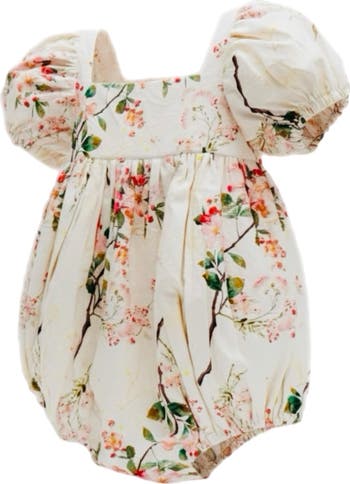The Elodie Bubble is a fully lined cotton bubble designed with a softly structured silhouette and gentle volume through the body, offering both comfort and a timeless shape for little ones. Crafted from breathable woven cotton and fully lined for added softness and durability, it feels substantial yet light against the skin. Delicate puff sleeves and a softly gathered waist create a classic rounded profile, while the three-tie back closure allows for an adjustable, secure fit and adds a quiet, vintage inspired detail. Gentle elastic at the leg openings provides ease of movement without feeling restrictive, making the Elodie Bubble ideal for everyday wear as well as special moments. Available in two color-ways, Ivory Botanical and Blush Botanical, each print is thoughtfully placed to highlight the natural flow of the fabric and the garment’s enduring design.