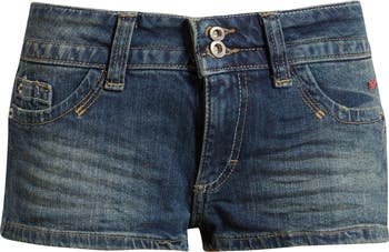 These vintage-wash denim shorts feature a wide low-rise waistband and a supershort inseam for a figure-flaunting fit.