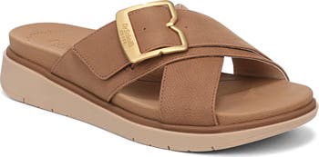 A logo-engraved buckle shines at the strap of a comfort-minded slide sandal designed with a Feel Good Foam insole and a cushy platform sole.