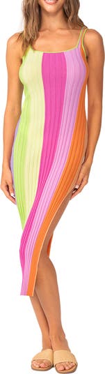 This vibrantly colorblocked midi dress is knit in a stretchy rib stitch that gives the cover-up its figure-loving fit and lets you show off a sun-kissed thigh with a soaring slit.