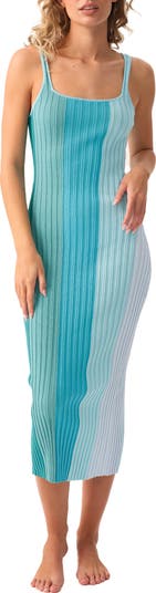 Show off a sun-kissed thigh through the slit of this colorblock dress knit in a stretchy rib stitch that gives the style its figure-loving fit.