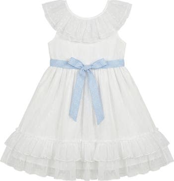Frothy layered ruffles begin the neckline of this mesh dress covered in dimensional clip dots and finished with a gingham sash.
