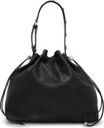 Brushed hardware highlights the soft leather exterior of a spacious bucket bag secured with a drawstring closure and suspended from an adjustable shoulder strap.