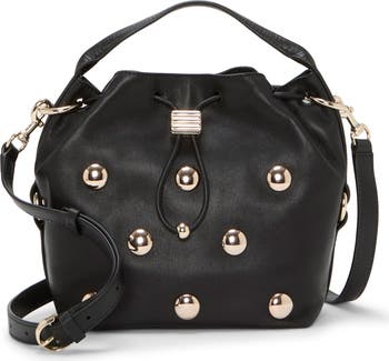 Brushed studs punctuate the leather exterior of a compact bucket bag secured with a drawstring closure and suspended from an optional crossbody strap for hands-free wear.