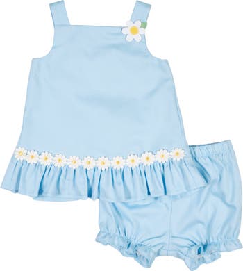 Sweet and thoughtfully detailed, this two-piece set is crafted from light blue finewale piqué in soft, breathable 100% cotton‚Äîperfect for springtime celebrations and sunny days. Appliqué daisies bloom at the front shoulder and back seat, adding playful charm from every angle. Designed with adjustable back button straps and a crossover back for a comfortable, custom fit, the tunic-length dress features a daisy-trimmed hem ruffle for gentle movement. The coordinating bloomer includes elastic at the waist and legs for easy comfort and coverage.
