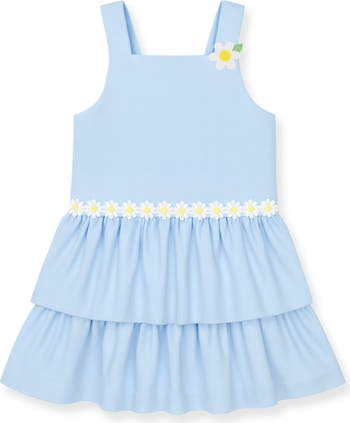Fresh and full of springtime charm, this dress is crafted from light blue finewale piqué in soft, breathable 100% cotton. Appliqué daisies bloom along the shoulder straps, complemented by daisy trim at the waist for a cheerful, polished finish. Designed with a drop waist silhouette, the double-tiered, shirred skirt creates beautiful movement and a playful feel. Adjustable back button shoulder straps ensure a comfortable, custom fit, while the above-the-knee length makes it perfect for spring celebrations and sunny days.