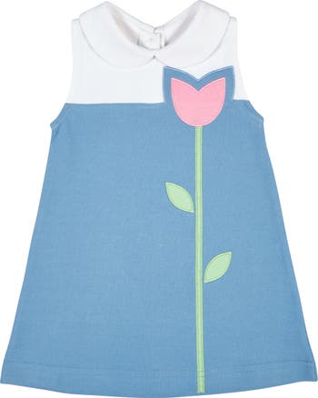 Fresh and timeless, this dress is crafted from medium blue piqué knit in soft, breathable 100% cotton—perfect for warm, sunny days. A crisp white piqué knit collar and yoke frame a charming appliqué tulip with delicate cutout detail, adding a sweet, spring-inspired touch. Designed with an easy A-line silhouette, it features a back neck button closure for simple dressing and falls above the knee for a light, carefree feel. Ideal for vacations, spring celebrations, and picture-perfect moments in the sunshine.