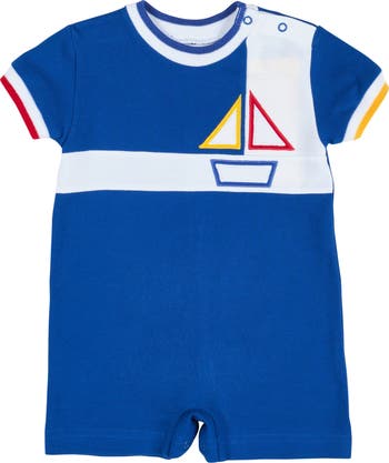 Playful nautical charm is captured in this boys' royal-and-white pique knit shortall. Featuring a cheerful sailboat appliqué, colorblock detailing, white rib trim with multi-color tipping, and convenient shoulder and inseam snaps for easy dressing.
