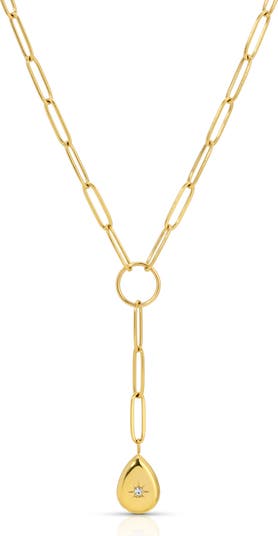 A cubic zirconia winks in a starburst setting at the center of this 14-karat gold-plated necklace.