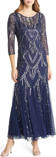 Lustrous beads shimmer and shine on this glamorous gown that's fitted through the torso with a full, godet-flounced hem.