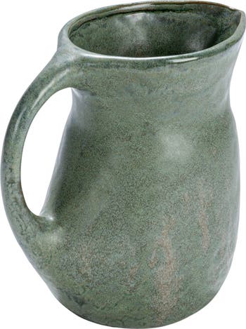 This stoneware pitcher with reactive glaze in matte teal is a stunning and practical addition to any home. It is made of stoneware, which is a premium and sturdy material that can withstand high temperatures and frequent use. It is microwave, oven, and dishwasher safe, making it easy and convenient to use and clean. It has a reactive glaze finish in matte teal, which creates a smooth and serene appearance. The glaze also makes each piece unique and slightly different. The pitcher has a round shape and a curved handle that makes it easy to hold and pour. It has a large capacity of 2.5 quarts, which is enough to serve a large group of people. It can be used for serving water, juice, milk, or tea, or for displaying flowers, plants, or utensils on a table or countertop. It can blend with any farmhouse, French country, coastal, lodge, or boho style kitchen or dining room. It measures 9 inches in length, 5 inches in width, and 8.5 inches in height, making it a generous and spacious pitcher. This will impress the guests and enhance the food presentation.