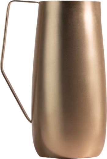This smart-looking pitcher is hand-crafted from new brass sheet and buffed to a nice shine. A generous 64 oz. capacity makes it great for entertaining or as a handy bar accessory. The angled handle provides an interesting juxtaposition to the rounded pitcher, whose rim features a slightly pinched spout for successful pouring.