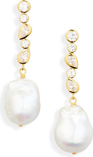 Introduce baroque elegance to your ensemble with these statement-making drop earrings featuring geometric-clustered strands of cubic zirconia suspended with sculpturally shaped freshwater pearls.