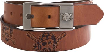 Enjoy a spirited accessory fit for cheering on your favorite team when you grab this Pittsburgh Pirates brandish leather belt. Featuring embossed team graphics repeated around the belt and an engraved team logo on the metal buckle, this adjustable belt has Pittsburgh Pirates spirit in spades and won't interfere with your polished personal style.