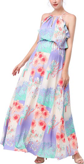 Flowing halter neck maxi dress in super soft crepe material in stunning colorful abstract floral print. Bottom portion of the top can snapped to show off your bump, or can be unbuttoned for a loose flowing look. Additional features include functional nursing design.