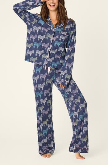 Supersoft pajamas are finished with a pop of contrast piping and covered in a playful print for a charming look in or out of bed.
