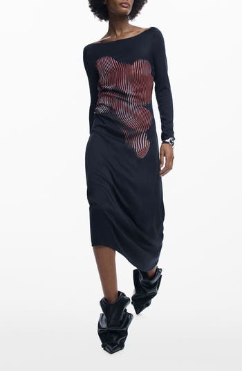 An abstracted bloom makes a mesmerizing statement for a groovy dress finished with an off-center hemline.