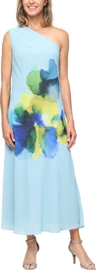 Brushstroked blooms add an artful aesthetic to a dreamy party dress cut to showcase one shoulder.