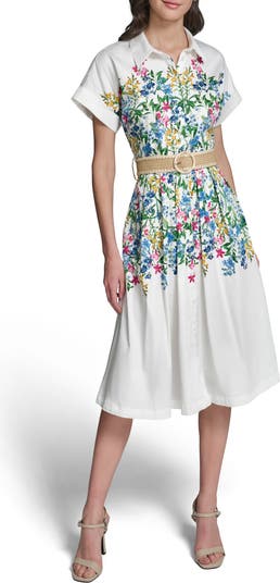 A raffia belt adds texture and charm to this crisp stretch-poplin shirtdress framed by abbreviated sleeve and romanced by vivid blooms.
