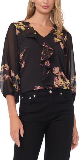 Rippling ruffles and delicate blooms define a lightweight top that's easily works for fun or fancy looks.