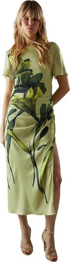 Make a statement in this eye-catching Warehouse midi dress that seamlessly blends comfort with style. The crinkle satin fabric adds a touch of luxury to your everyday wardrobe, while the ruched detailing accentuates your silhouette in all the right places. The bold botanical print commands attention, making this dress a true conversation starter. Perfect for various daytime occasions, from casual brunches to family gatherings, this dress offers endless styling possibilities.