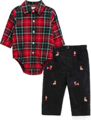 Baby will be ready to show off their festive side in this soft cotton set that pairs a plaid bodysuit with pup-embroidered corduroy pants.