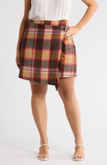 Feathery fringe adds texture and movement to this brushed leggy-length wrapped skirt covered in warm checks.