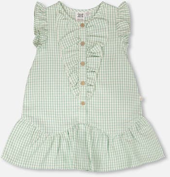 Our plaid poplin dress in green is a sweet mix of comfort and charm. This sleeveless A-line silhouette features flutter ruffles at the shoulders, a round neckline, and a button placket adorned with cascading ruffles on the chest. With its gathered flounce hem and classic plaid pattern, it’s a playful choice for girls and baby girls.