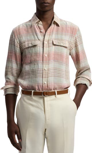 Designed for days that call for comfort but still want polish, this shirt is made in Italy from airy linen with a vintage-inspired feel. Custom-dyed yarns create a madras-style plaid that feels relaxed yet intentional. Mother-of-pearl buttons finish the piece with a clean gleam that reads unmistakably special.