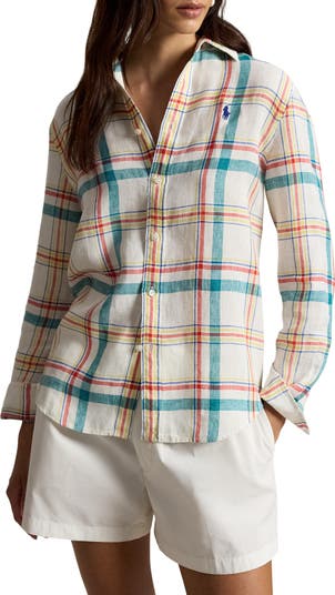 Dropped shoulders enhance the relaxed fit of this crisp linen shirt covered in a lively plaid print and cut with a tuckable curved hem.