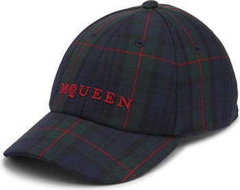 An embroidered logo is cast in signature crimson on a wool-warmed baseball cap patterned in classic plaid.