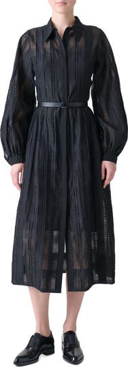 A symphony of textures, this belted shirtdress is patterned in tonal, woven-in plaid that highlights the sheer, parchment-like organdy fabrication for an elegantly unorthodox approach to a staple workwear style.