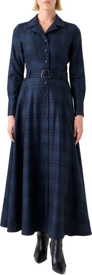 Akris showcases its tailoring finesse with this A-line shirtdress cut from luxurious wool flannel and patterned in a subtle plaid. A coordinating belt with a trapezoid buckle completes the look with signature flair.
