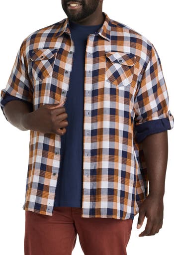 Crafted in 100% cotton, this plaid sport shirt is the casual layer you need for warm weather. Lightweight and comfortable, it allows for the freedom to move without restriction and is designed at DXL with proper proportions for Big + Tall guys. It's perfect on its own or layered over a T-shirt and left open. L eave it untucked and pair it with dark jeans for a cool, put-together look. Plus, roll up the sleeves to reveal a coordinating solid color!