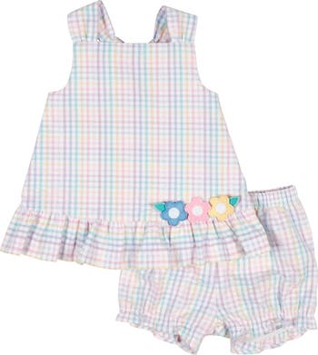 Bright and breezy, this two-piece dress is crafted from multicolor pastel plaid seersucker in soft 100% cotton. Appliqué flowers in pink, yellow, and blue bloom across the hem, while a sweet bow detail at the back neck adds an extra touch of charm. A shirred ruffle hem gives the dress gentle movement, and the coordinating bloomer, with elastic at the waist and legs, keeps her comfortable through every sunny adventure. Designed to fall above the knee, it’s perfect for spring celebrations, vacations, and warm-weather play.