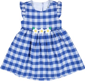Sweet and summery, this plaid seersucker dress blooms with charming appliqué flowers at the waist. Featuring fluttering ruffle sleeves, a playful crisscross button-back design, and comfortable elastic at the back waist for ease of movement.