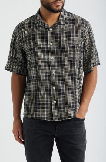 Head into a summery weekend well-prepared in a perky plaid shirt offered with a handy chest pocket and cut from a breezy blend enriched with linen and cotton.