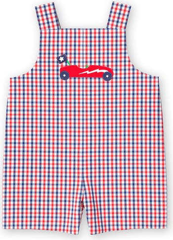 Made for summer fun and hometown celebrations, this shortall is crafted from red, navy, and white plaid seersucker in soft, breathable 100% cotton. A cheerful appliqué derby car adds a playful nod to classic summer traditions, from parades to backyard festivities. Designed with a square neckline and adjustable button straps for a comfortable, just-right fit, the sleeveless silhouette keeps little ones cool on warm days. Inseam snaps make changes quick and easy, so the fun never has to slow down.