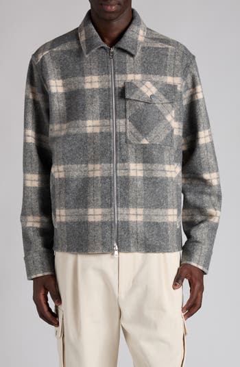 A hazy plaid patterns this wool-warmed shirt-jacket designed in a smartly structured silhouette and streamlined with a two-way zip closure.