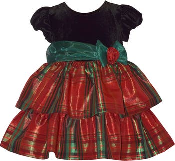 Get them ready to celebrate in this double-tiered party dress featuring a stretch-velvet bodice and a plaid taffeta skirt.