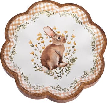 - This decorative wood tray enhances seasonal spaces with a fresh floral and bunny motif, perfect for Spring, Easter, or Summer styling. Display it on a coffee table, dining table, or entryway console to add charm and functional elegance to your home.