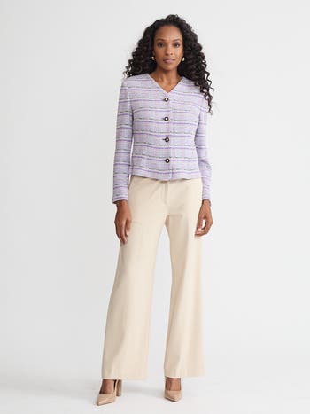 This sophisticated tweed jacket features a horizontal weave that adds a modern twist to a classic silhouette. The structured design is accented by ornate style buttons and a clean V neckline for a polished professional look. It pairs perfectly with the matching skirt or tailored trousers to create a timeless ensemble for any formal occasion.
